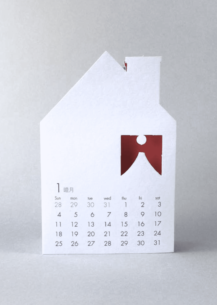 レーザーカットができる印刷会社のプロモーション品として提案したものです。四六全紙の長辺いっぱいを使った蛇腹構造で、窓の部分をレーザーカットでくり抜き、それぞれの月を象徴する風物を背景として表現するという提案です。