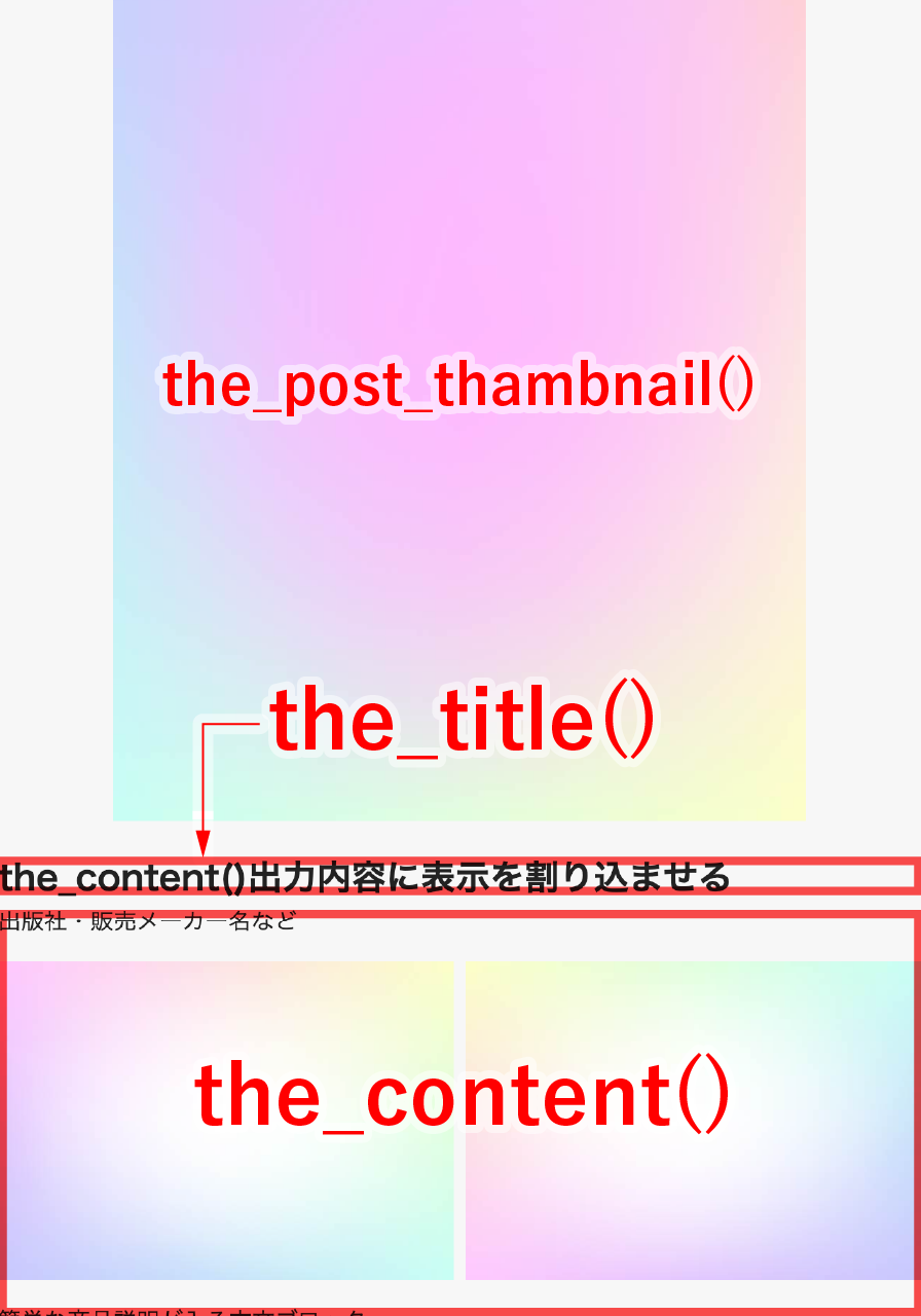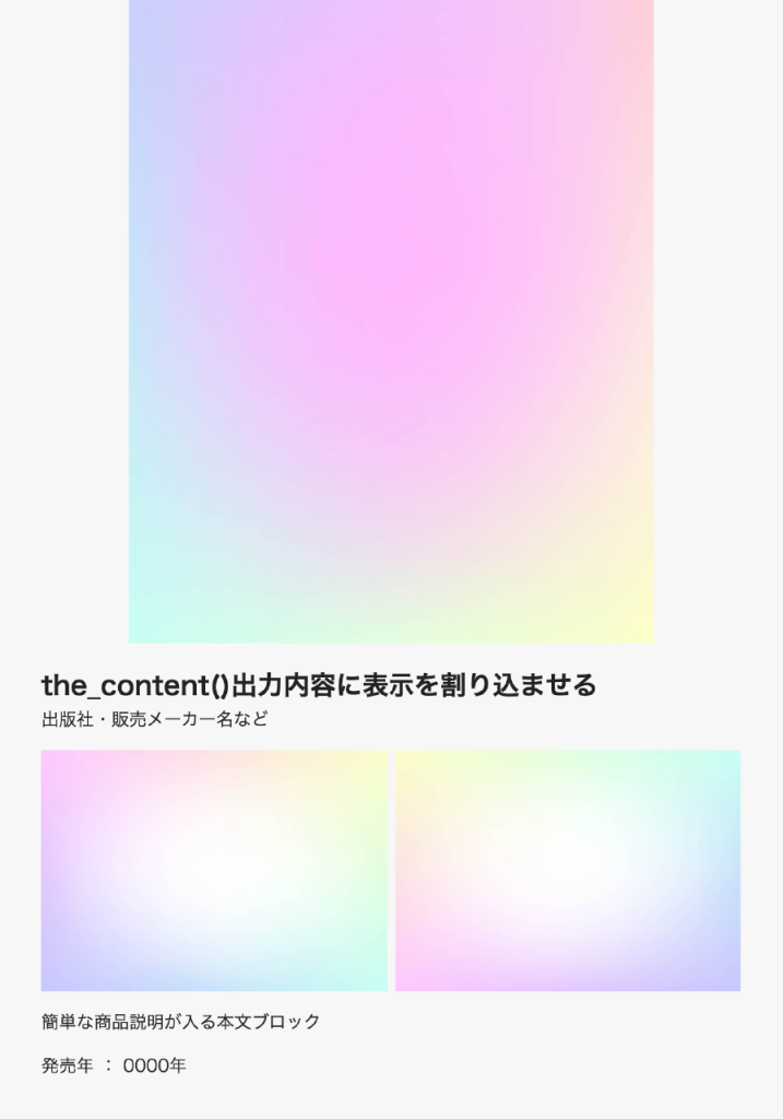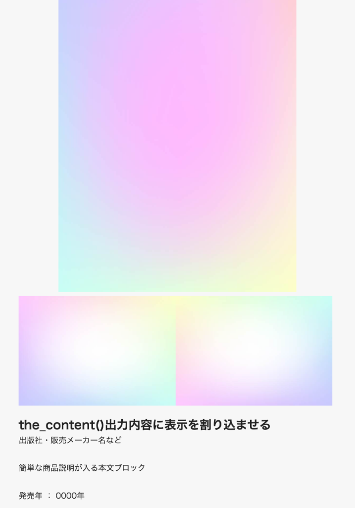 the_content()で出力されるのは<p>出版社・販売メーカー名など</p>から<p>発売年 : 0000年</p>の部分。今回まとめて表示したいのは<figure class=”works-image”>と<div class=”wp-block-group double-columns”>です。その間に<h2 class=”post-heading”>と<p>が割り込んでいます。