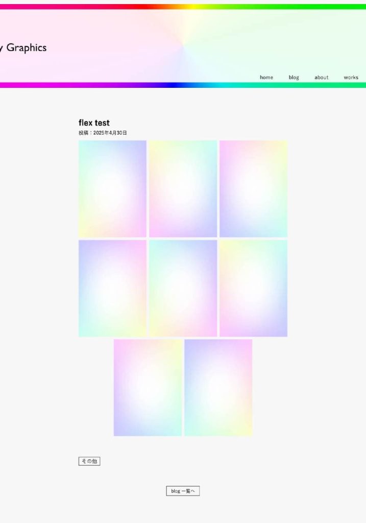 flex-wrap: wrap; gap: 0.5em; を指定。最後の行をセンター寄せにしたいので、justify-contents: center; を指定しました。子要素のfigure.works-imageにwidth: calc((100% – 0.5em) / 2); と指定し、デスクトップ用にwidth: calc((100% – 1em) / 3); を指定。ウインドウ幅によって画像のサイスを切り替え、配置が変更されるようにしました。親要素と等しい幅(100%)から0.5emまたは1emを引いてから等分しているのは、画像の間隔(gap)の分を差し引いています。