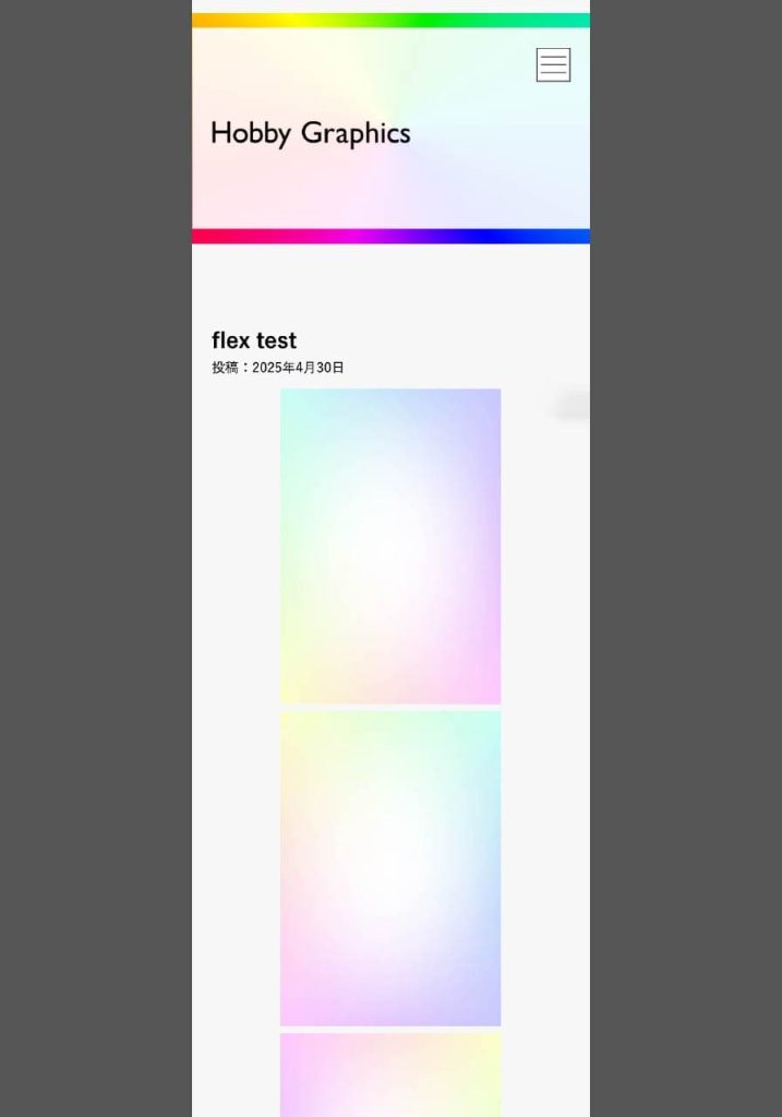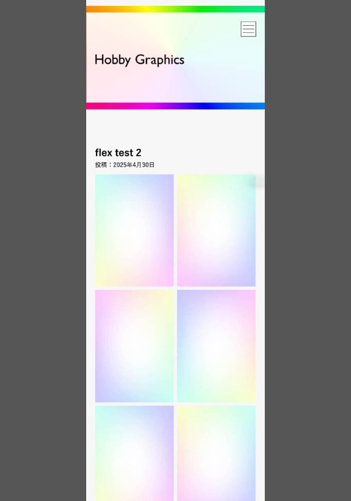 内容は、スマホでは画像を2列の横並びに、タブレットくらいのウインドウ幅以上では3列にし、それを超えたものは下に折り返していくという配置です。最後に余る画像はセンター寄せにしたいと思いました。