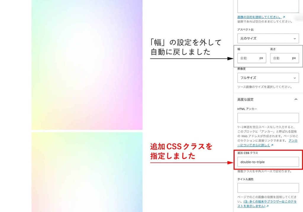 flexの配置はflex item(今回はfigure)の設定で決まるので、ブロックエディターの画像ブロックに「double-to-triple」という追加CSSクラスをつけました。