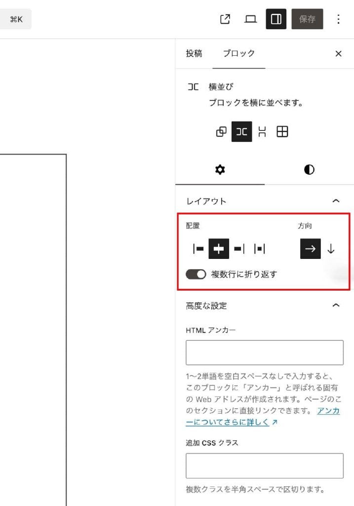 あらためてWordPressの編集画面を見直すと、画面右側のサイドメニューに「複数行に折り返す」という項目があって、その設定を有効にすると「横並び」のブロックが flex-wrap: nowrap; から flex-wrap: wrap; に切り替わるようです。また、その上の「配置」という項目で justify-content の値を切り替えることができました。